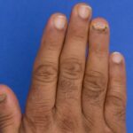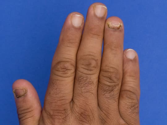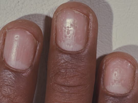 - It can appear as discolouration of the nail, tiny dents in the nail, fragile nails, blood under the nails, or the nail separating from the finger or toe.