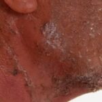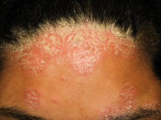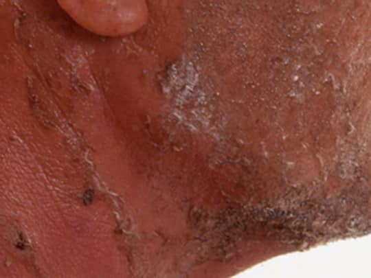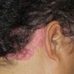 It is estimated that 50% of people living with psoriasis will experience psoriasis on their face. It can occur on the eyebrows, between the nose and upper lip, upper forehead and hairline. Facial psoriasis may also appear around, behind, and in the ears. Symptoms include red or discoloured skin, itching and scaling.