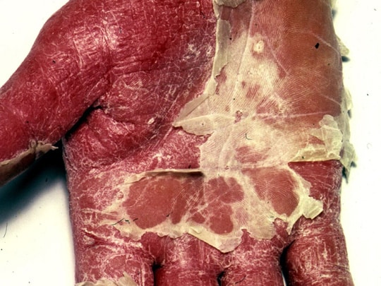 - Widespread, acutely painful plaques of inflamed skin develop suddenly.