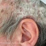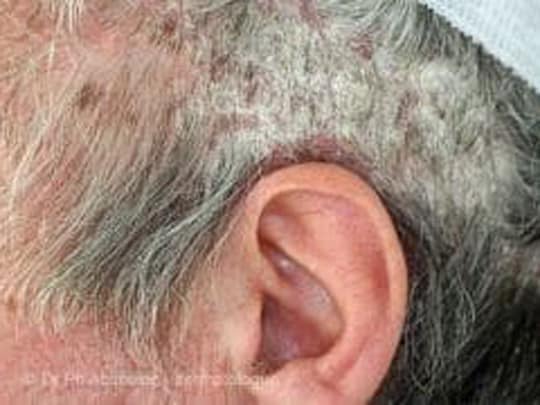 Research finds that 45-56% of people living with psoriasis have it on their scalp. Scalp psoriasis is also found on the hairline, forehead, back of the neck and around the ears. In mild cases, it may look like dandruff. In more severe cases, it may be thick, crusted plaques covering the entire scalp.