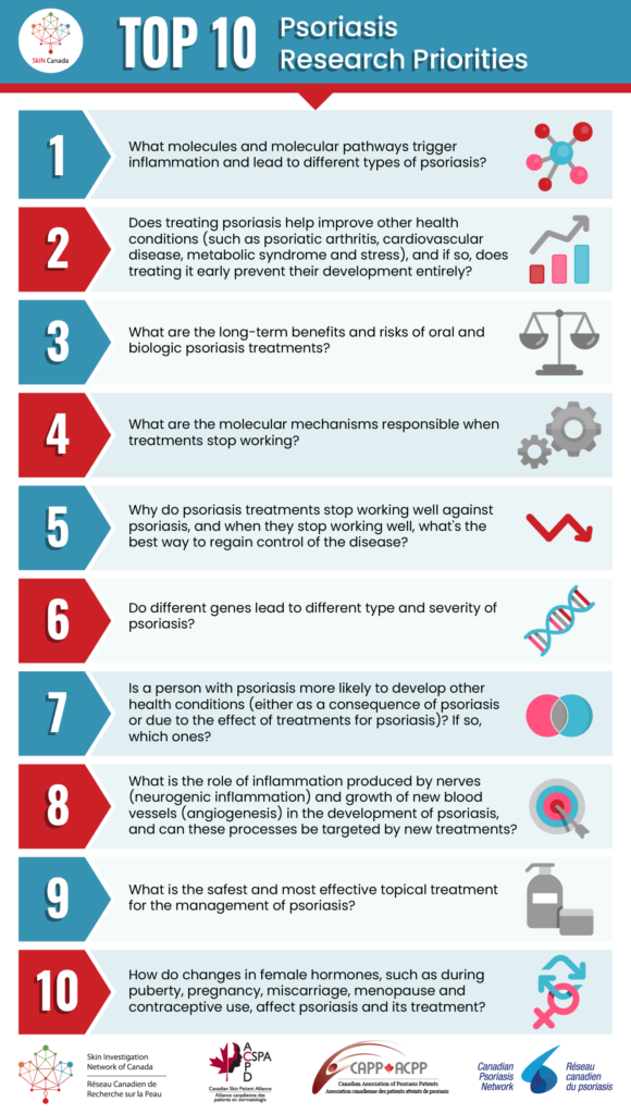 The skin patient community across Canada worked with researchers and healthcare providers to develop lists of the Top 10 research questions facing their skin patient communities.  CAPP worked with the Skin Investigation Network of Canada (SkIN Canada), and other patient organizations to reach out to patients and caregivers impacted by psoriasis so they could tell us what they thought were the most important questions about psoriasis for research to answer.
